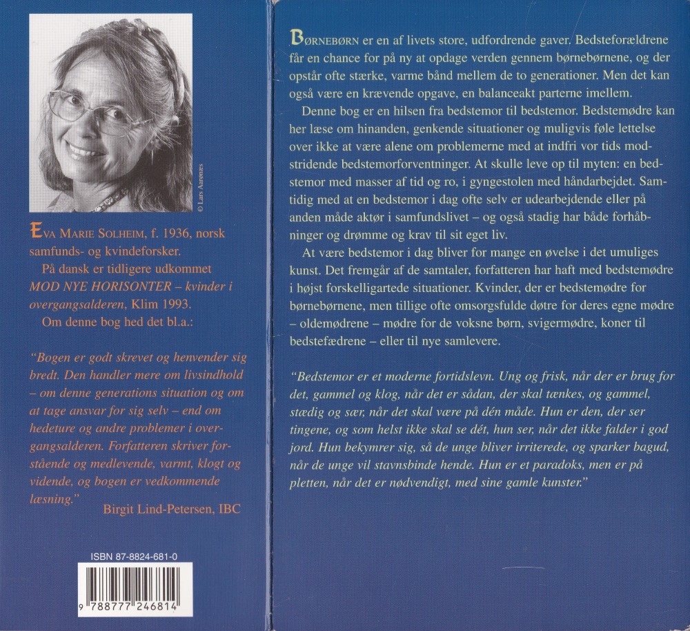 - Bedstemor? En dejlig rolle, sagde én, som jeg tilfældigt fortalte, at jeg var ved at skrive en bedstemorbog. - En dejlig og vanskelig rolle, føjede hun eftertænksomt til. - For vi kan jo så tydeligt se de fejl, forældrene (vores børn) gør, og som vi også gjorde, da vi var unge forældre. Det skærer os i hjertet, for vi ønsker, at de kære små skal leve i paradis. Vi må ikke glemme, at de unge har ret til at begå deres egne fejltagelser, selv om det kan være frygteligt at stå ude på sidelinien og ikke kunne foretage sig noget som helst.